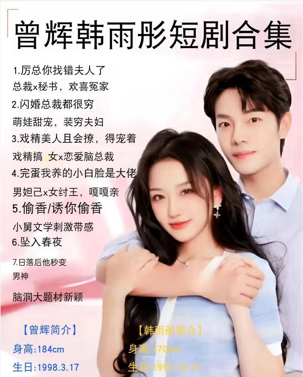 接着是曾辉与韩雨彤这对备受刺标的“落日雨辉”组合。两东谈主不仅颜值出众,演技也相等塌实,深受不雅众嗜好。韩雨彤领有畅达的骨骼线条和精细的五官,身高170厘米,头身比例竣工。岂论是穿戴当代服装搭配大海潮发型的御姐造型,照旧优雅的古装饰相,她齐令东谈主大为惊艳。她在不同期期的变装切换自如,尤其是在哭戏方面,神气深千里,时常能在40秒内令不雅众肉痛不已。而曾辉,身高184厘米,专注于猖獗总裁变装的演绎,被誉为“霸总专科户”。他舍弃了传统的“面瘫式”上演,擅长通过微脸色和算作细节,将变装的神气精准地传达出来。固然他和韩雨彤已调和了七部短剧,并未崇敬官宣恋情,但两东谈主之间的亲密互动照旧引东谈主注释。